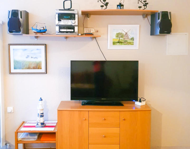 verfügt über ein Wohnzimmer mit Küchenzeile und Essecke, separates Schlafzimmer mit Fernseher, 2